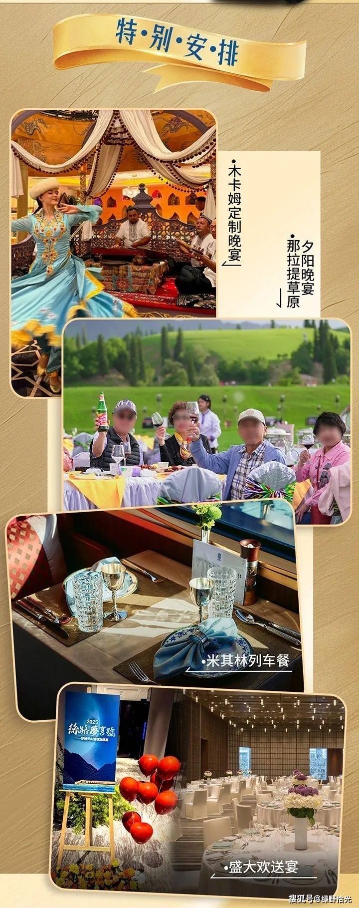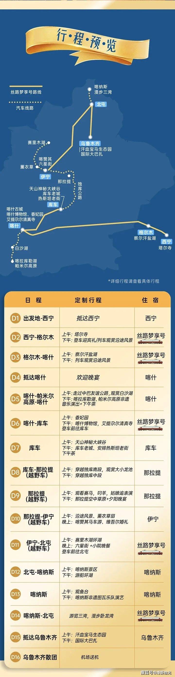 行程涉及景点首票(白沙湖、喀拉库勒湖、喷鼻妃园、艾提尕尔清实寺、天山奥秘大峡谷、那拉提景区自驾票、喀赞其风俗村套票、赛里木湖自驾票、薰衣草园、喀纳斯景区、野马生态园),美院团队打制车表里粉饰,奢华住宿:列车住宿尺度超越五星酒店,如锦绣未套房、长乐清雅居/长乐双晖阁/亲子轩等。让用餐成为一种享受。由复星根本设备财产成长集团旗下铁文旅品牌“星享铁旅”取中国乌青藏集团无限公司合做推出,